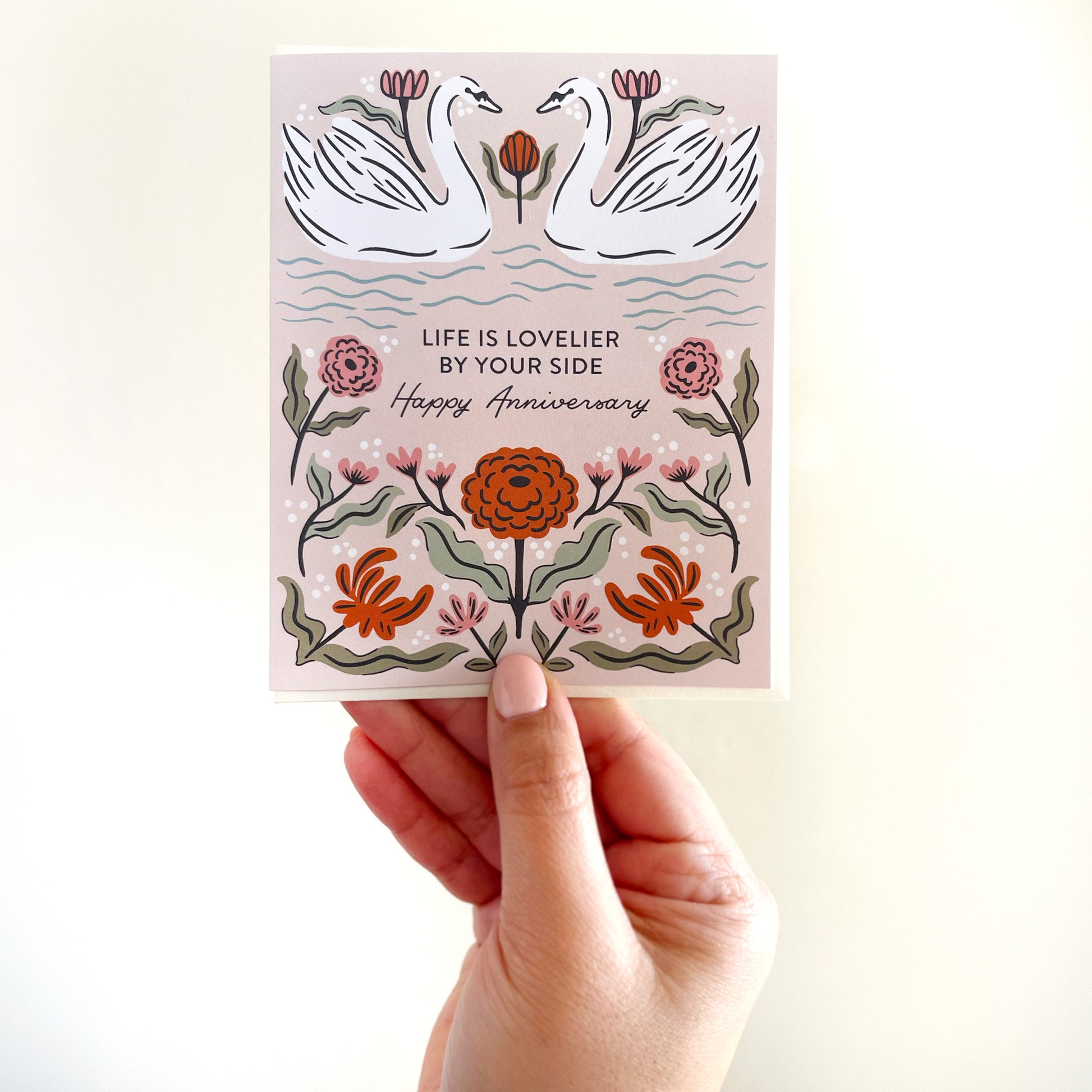 Celebrate lasting love with this romantic anniversary card featuring two elegant swans surrounded by soft, hand-illustrated florals. The heartfelt message reads: “Life is lovelier by your side. Happy Anniversary.” A perfect tribute to partnership, devotion, and timeless romance.