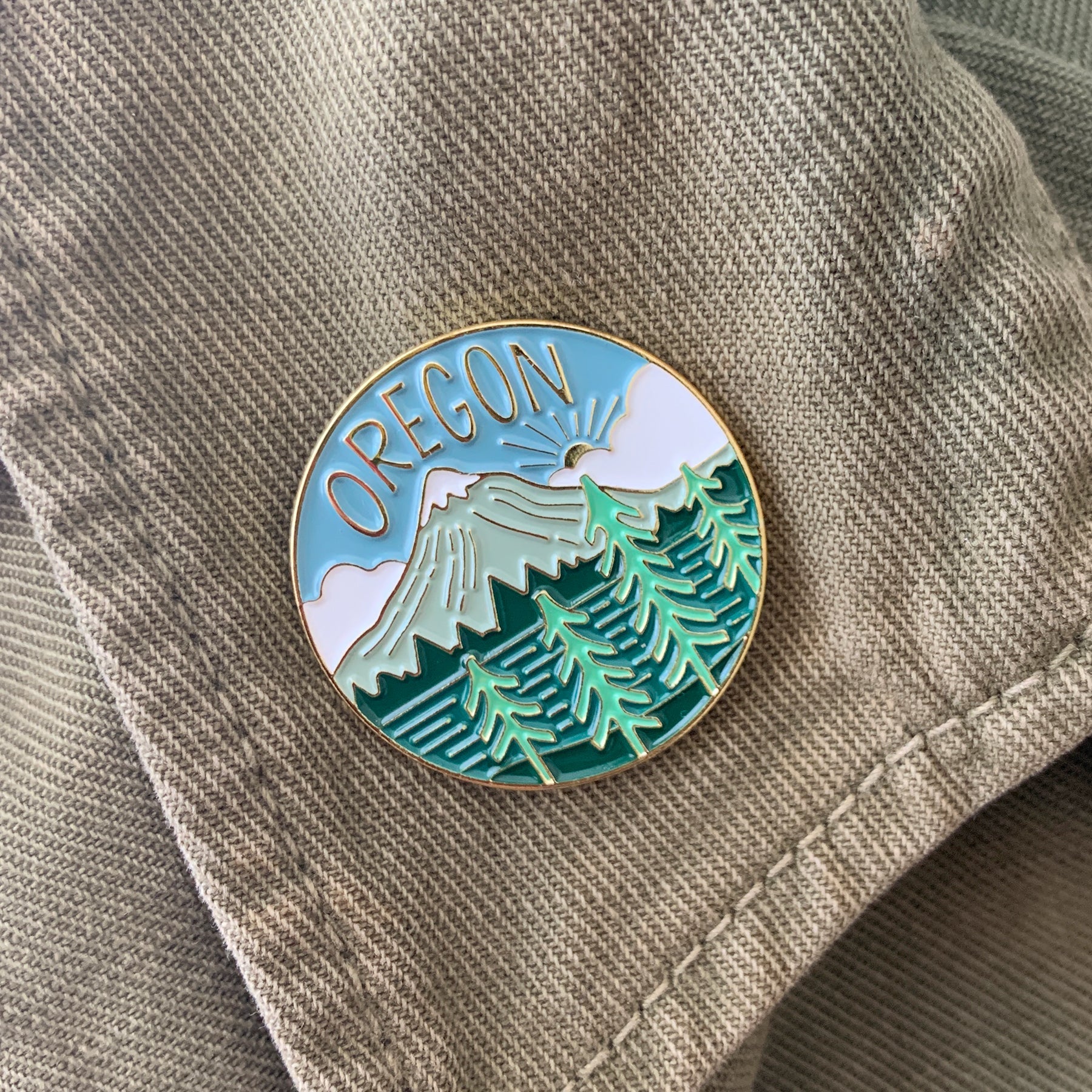 Capture the essence of Oregon with our retro-inspired enamel pin. This design showcases the scenic landscape and the unique charm of Oregon. Carry a touch of the Pacific Northwest's beauty wherever you go.