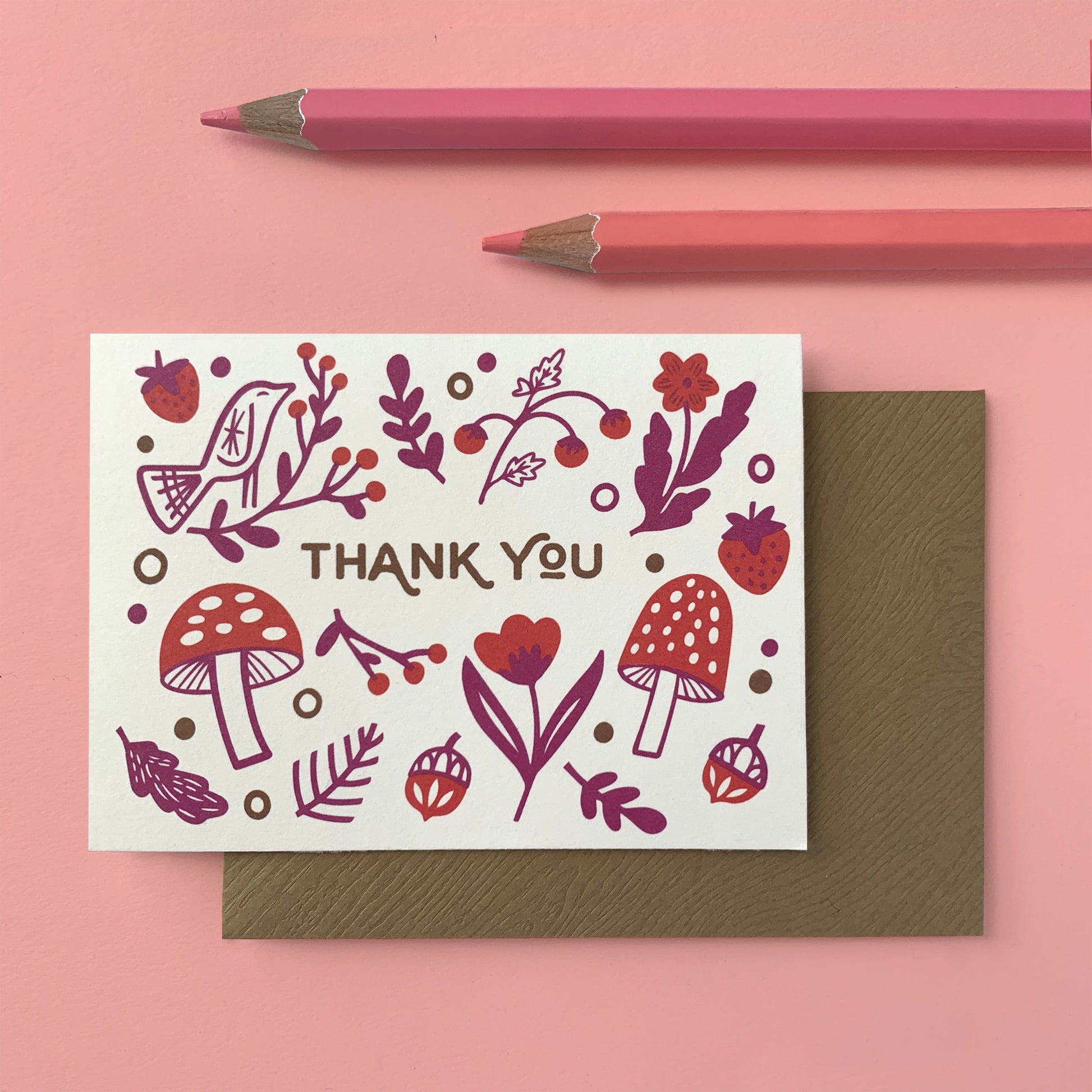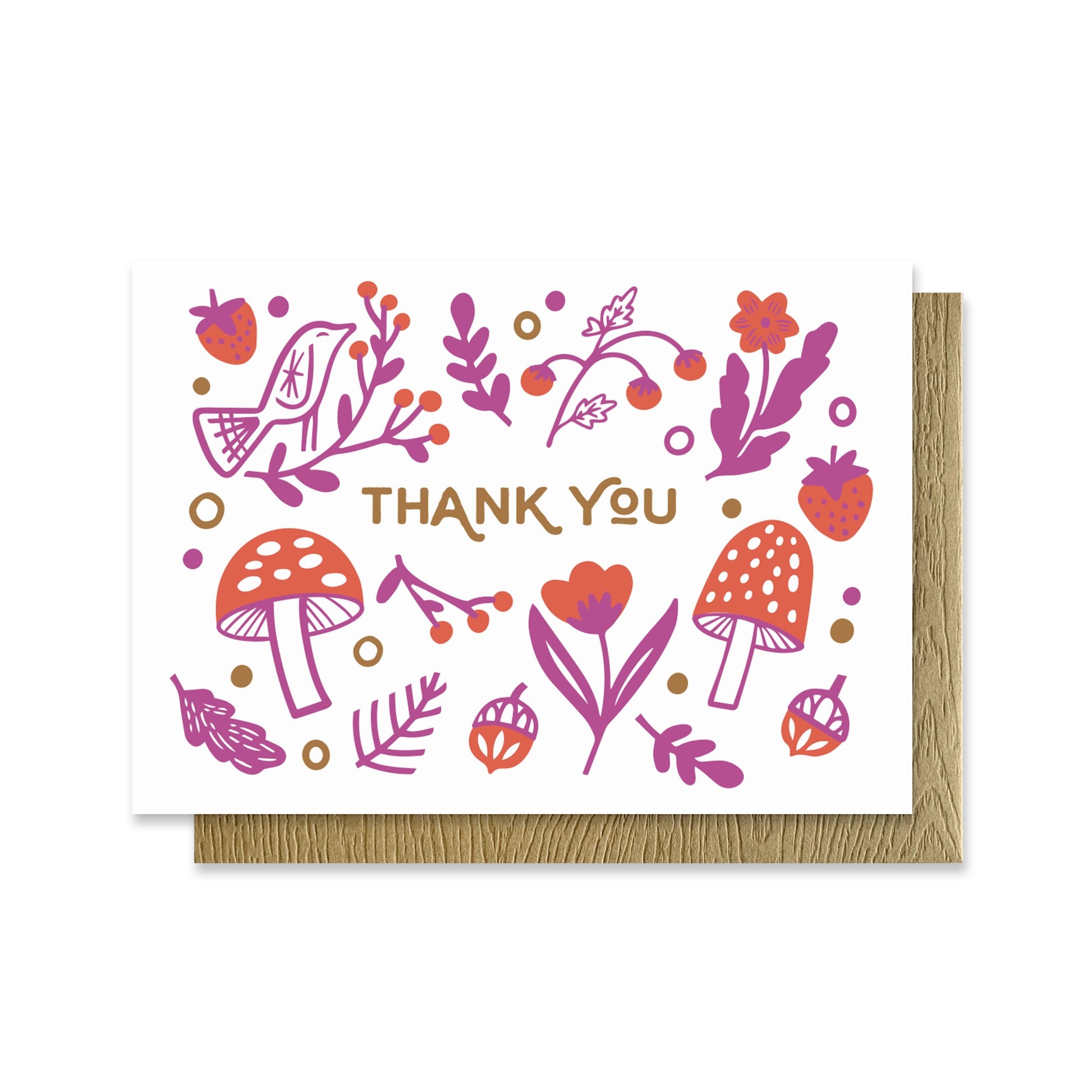 A folksy mini thank-you card featuring hand-illustrated forest friends, mushrooms, birds, and florals. A charming way to share your gratitude. Perfect for pairing with a gift, bouquet, or bottle of wine.