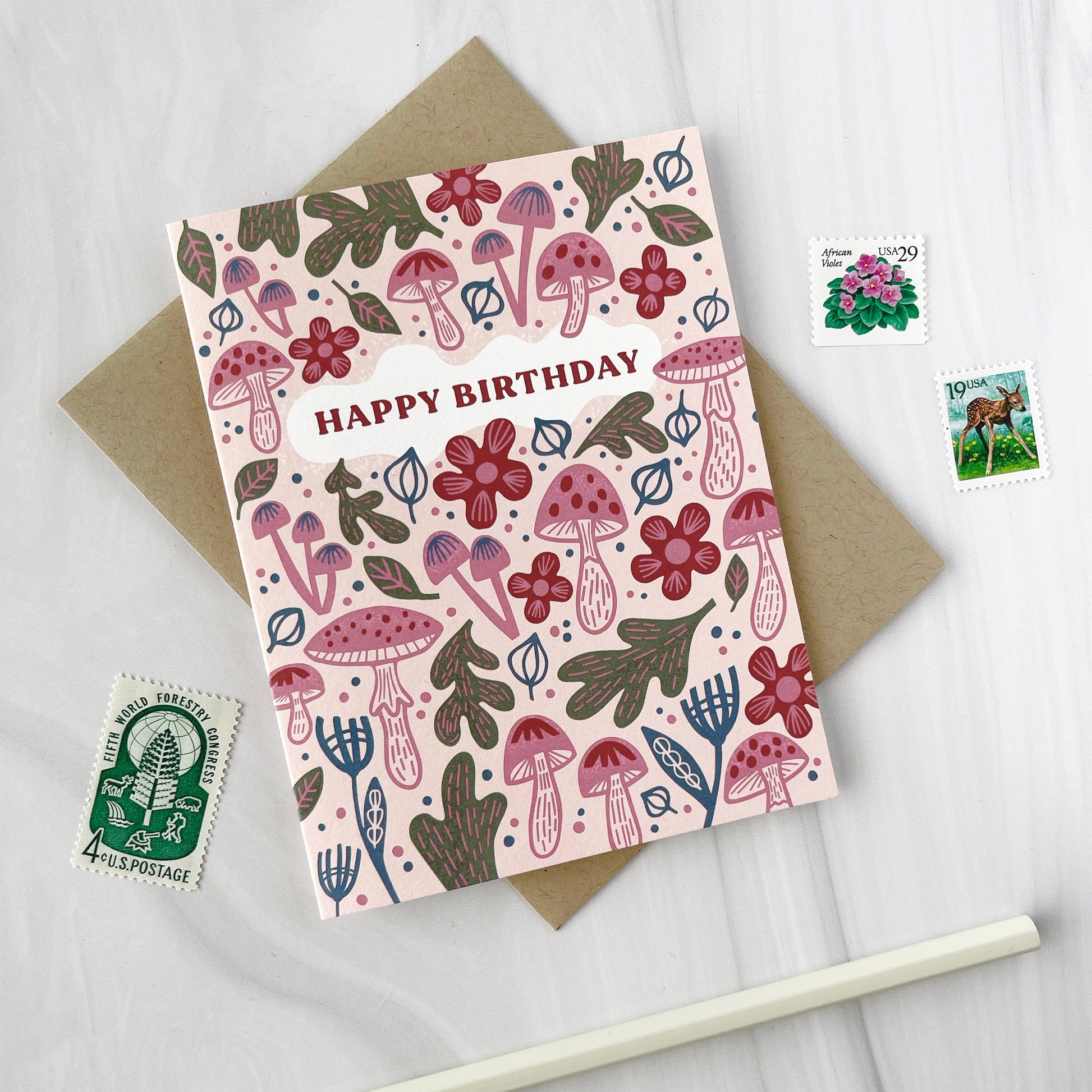 A whimsical birthday card for the nature lover and mushroom admirer. Featuring a lush forest scene with scattered fungi on a soft pink background, this Forest Fungi design brings a touch of woodland magic to any celebration.