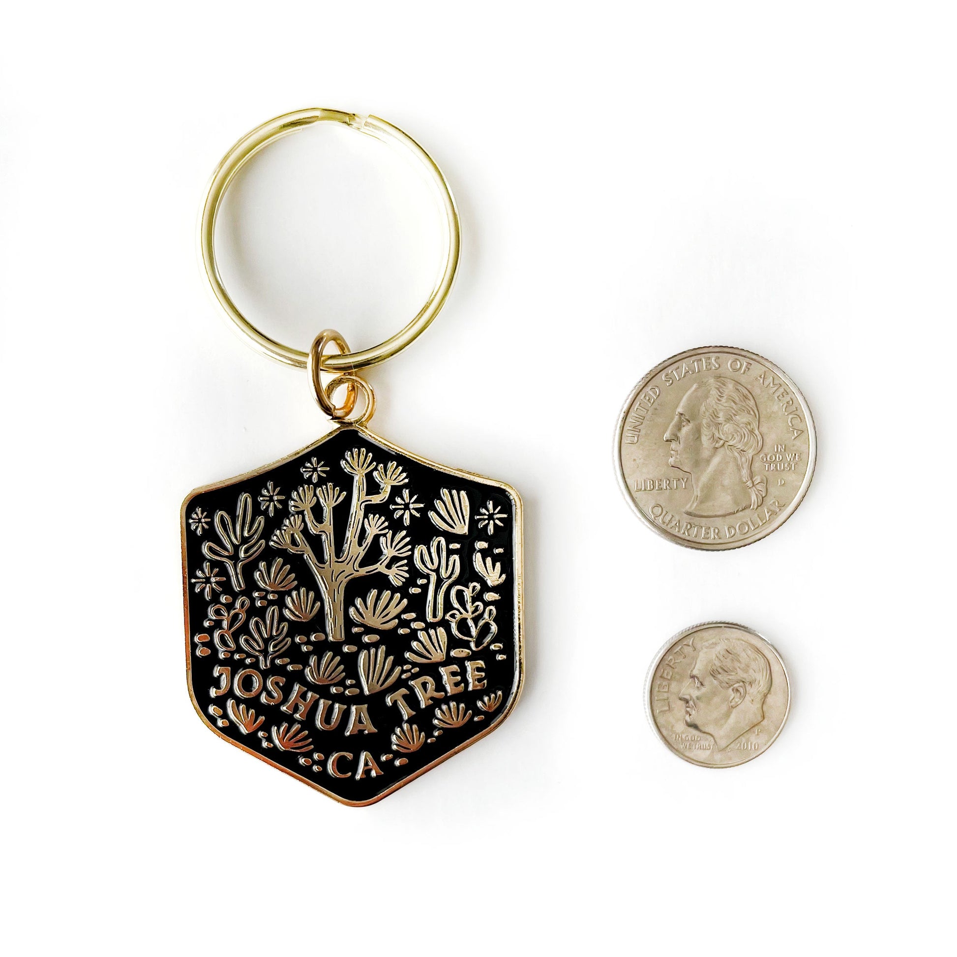 Embrace the spirit of Joshua Tree with our enchanting enamel keychain. This badge-shaped keychain is a piece of art that captures the essence of the desert landscape. Perfect for nature lovers and wanderers, let the Joshua Tree keychain be your symbol of adventure and connection to the beauty of this unique National Park.