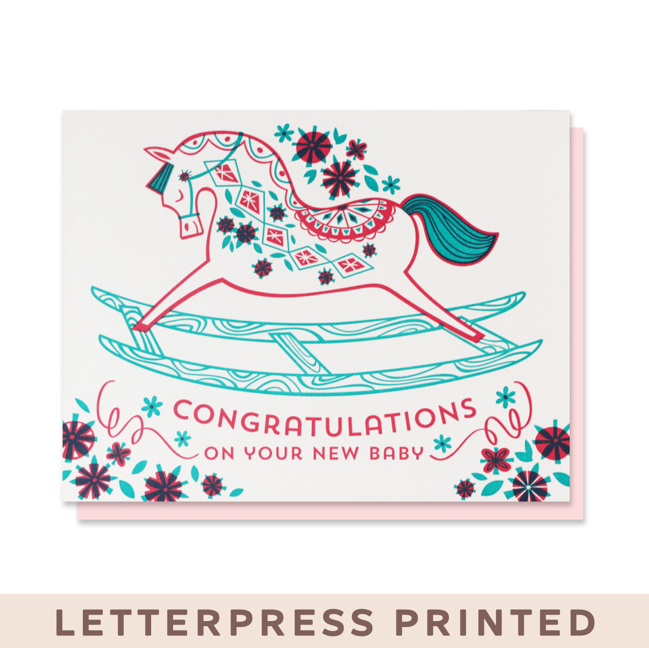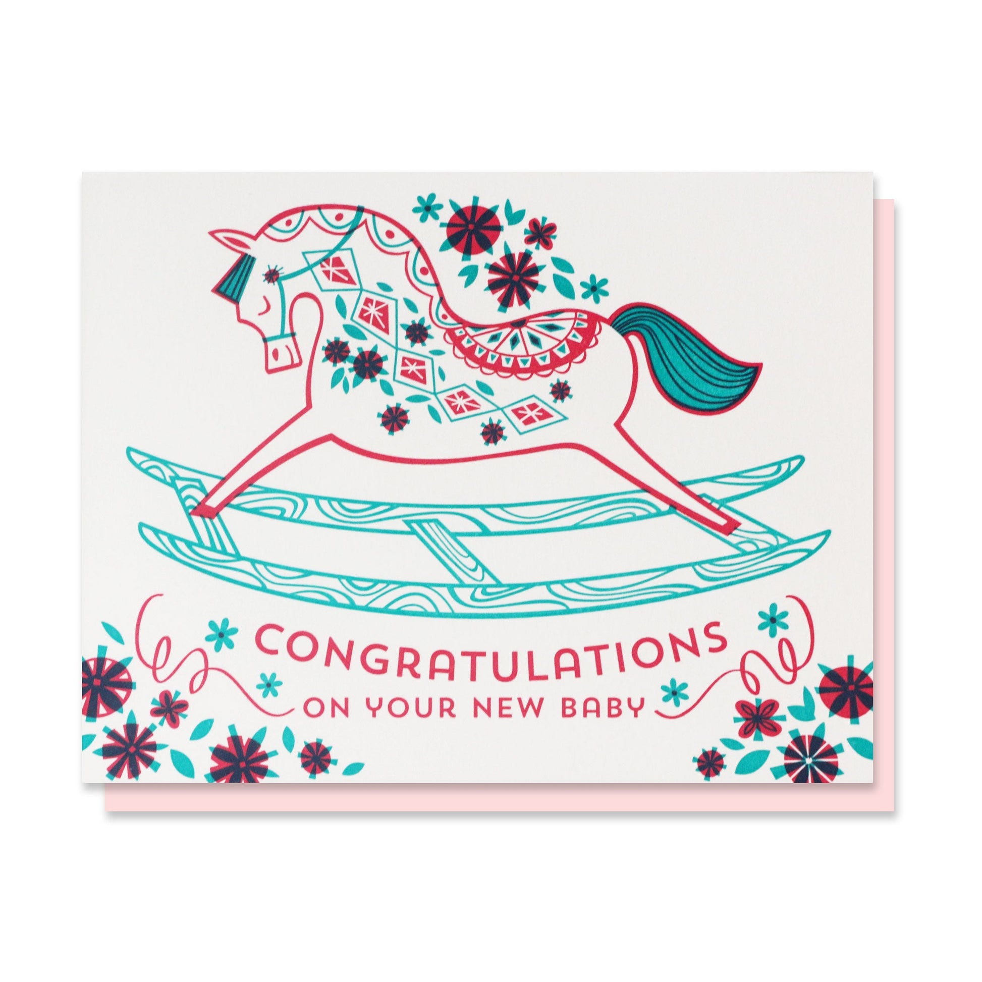 Celebrate the arrival of your little one with our charming congratulations card, featuring a retro-inspired rocking horse in delightful shades of pink.