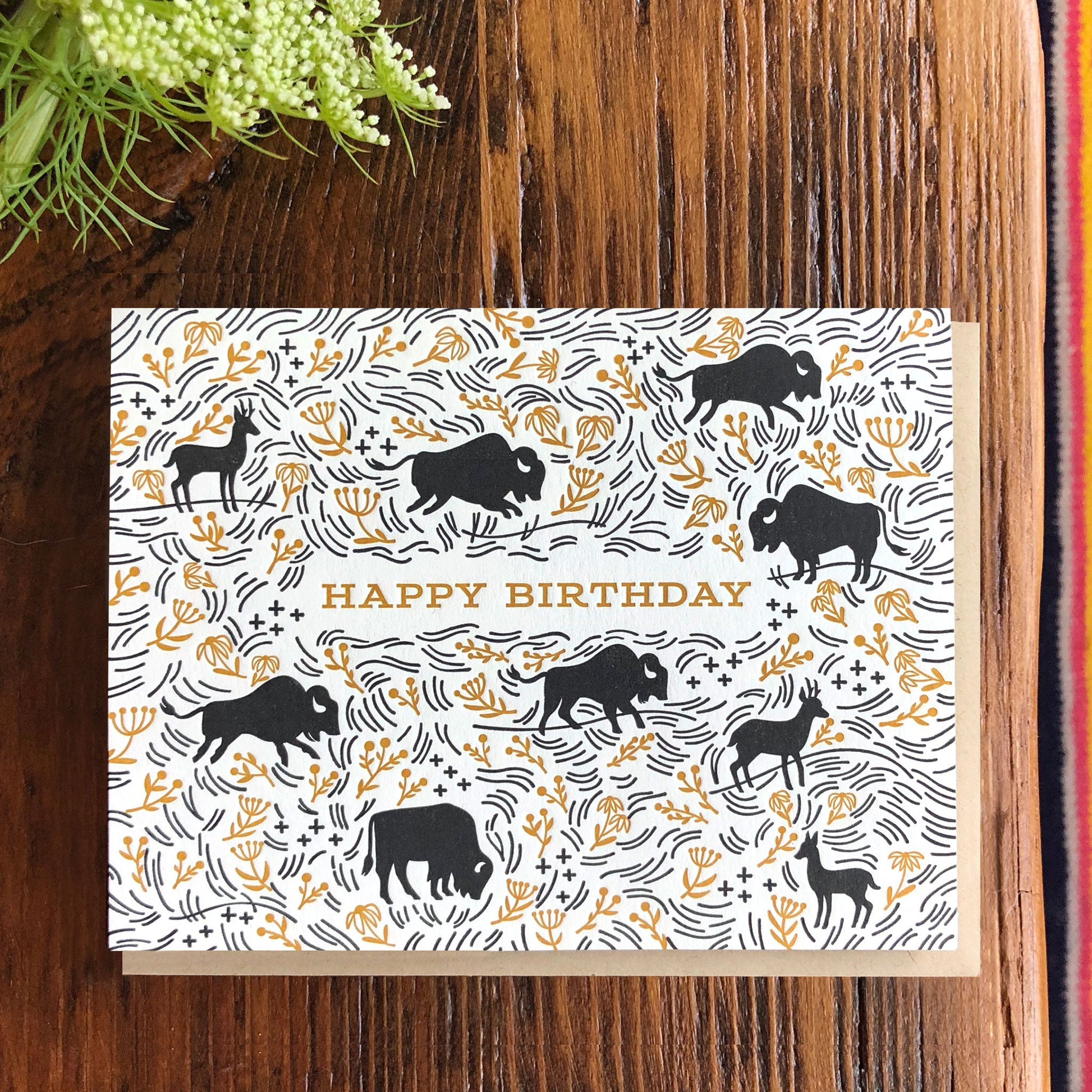This two-color letterpress card captures the quiet beauty of the American prairie, featuring buffalo and antelope roaming wide open grasslands. Printed in earthy, neutral tones, this nature-inspired design is perfect for outdoor lovers, Western-themed gifts, or rustic stationery collections.