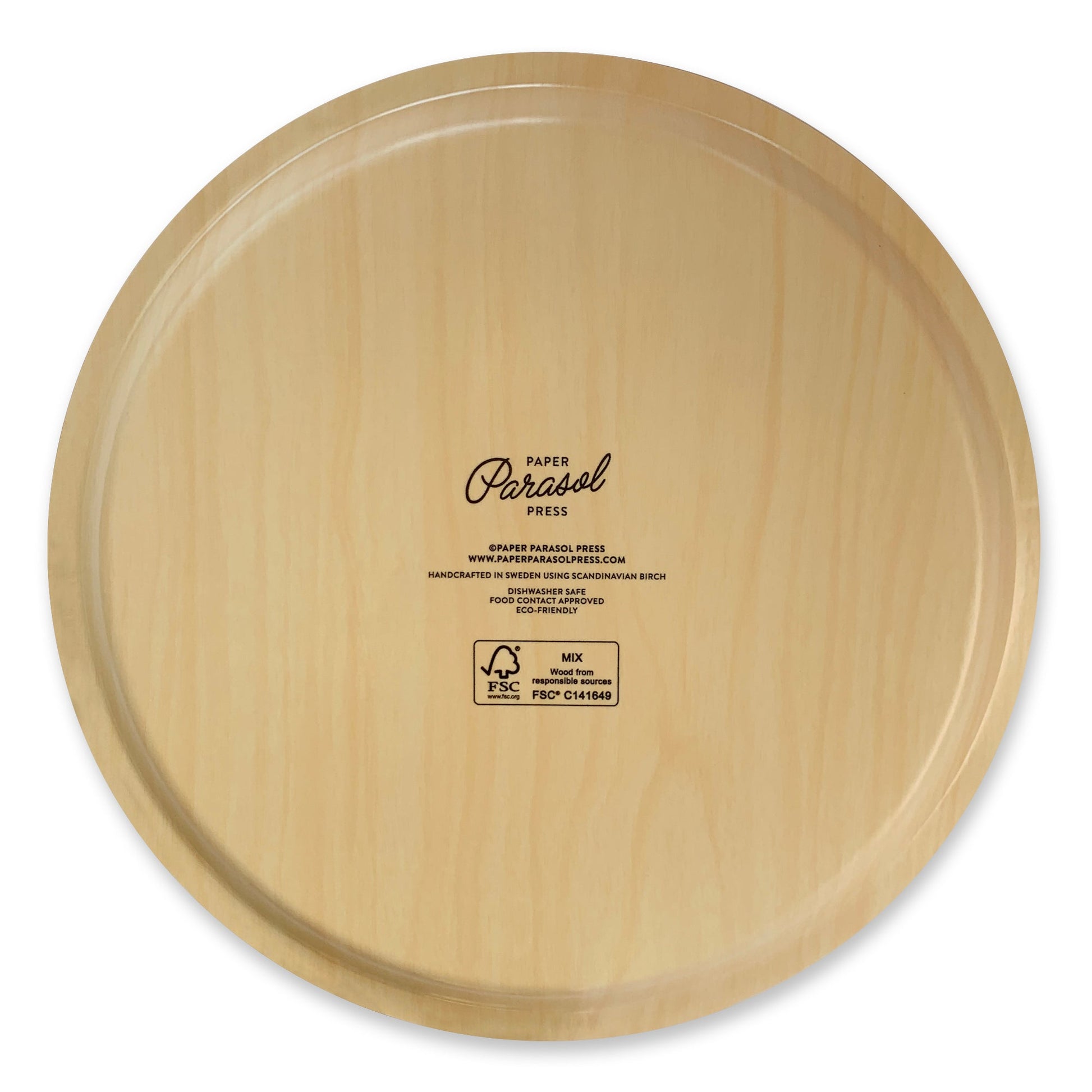 Bring a touch of Scandinavian charm to your home with this large round tray, featuring a lush forest design of mushrooms and leaves. Each tray is individually crafted in Sweden from FSC®-certified Scandinavian wood, ensuring both quality and sustainability.